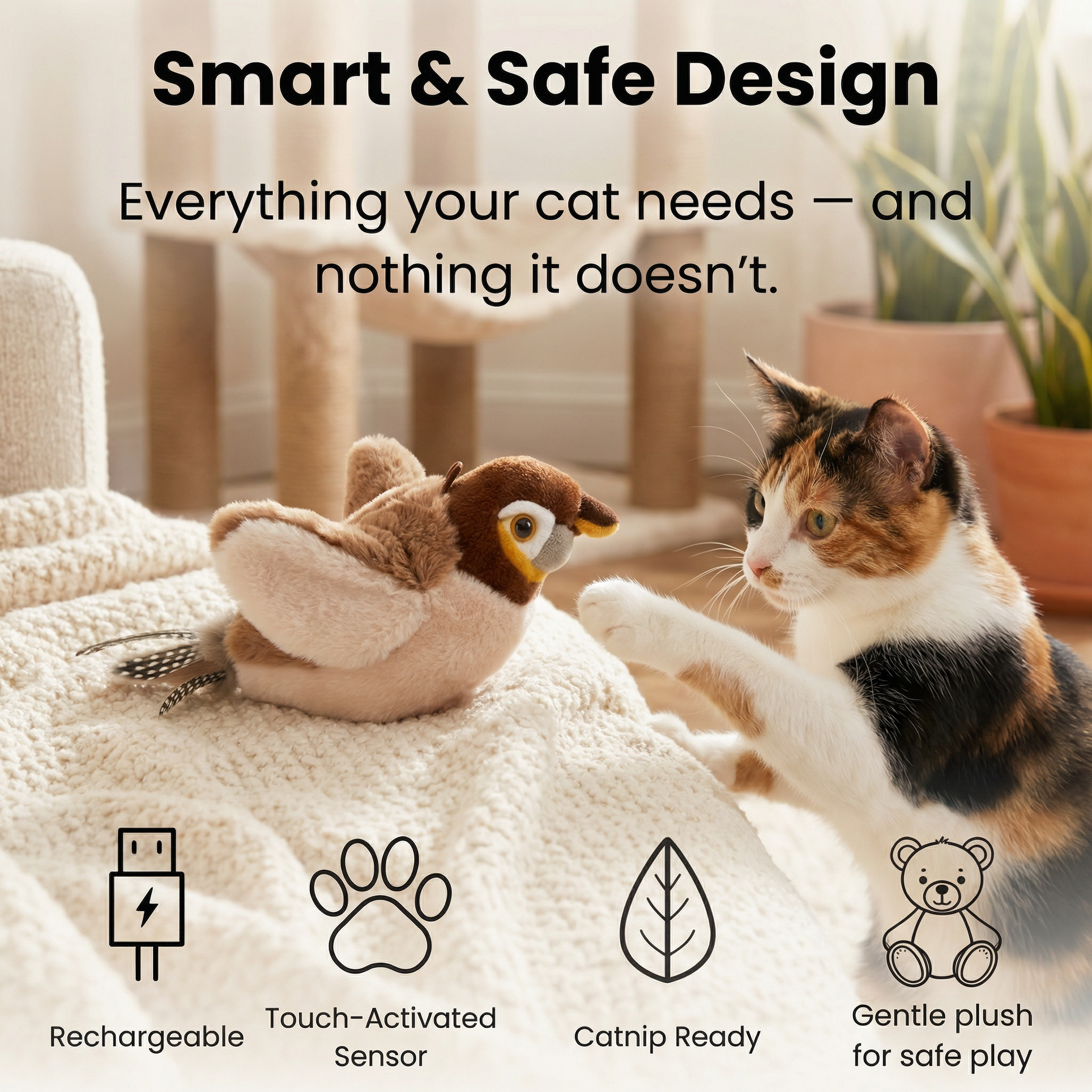 Realistic flapping wings and gentle chirping sounds spark your cat’s natural hunting instincts — keeping them active, focused, and happily engaged every day.
